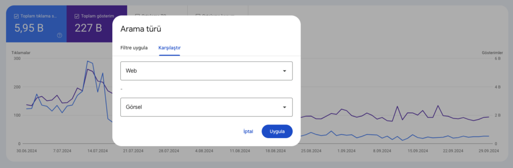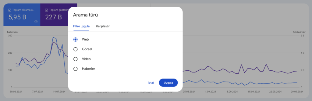 Yukarıdaki görsellerde gösterildiği gibi, Arama Türü filtreleme özelliği iki farklı seçenek sunuyor: “Filtre Uygula” ve “Karşılaştır”. “Filtre Uygula” sekmesinde, kullanıcılar web, görsel, video ve haber sonuçları arasında tek bir tür seçerek filtreleme yapabiliyor. “Karşılaştır” sekmesinde ise iki farklı arama türünü karşılaştırmak mümkün. Bu özellik, hangi arama türünün daha fazla tıklama ve gösterim aldığını analiz etmek için oldukça yararlı.